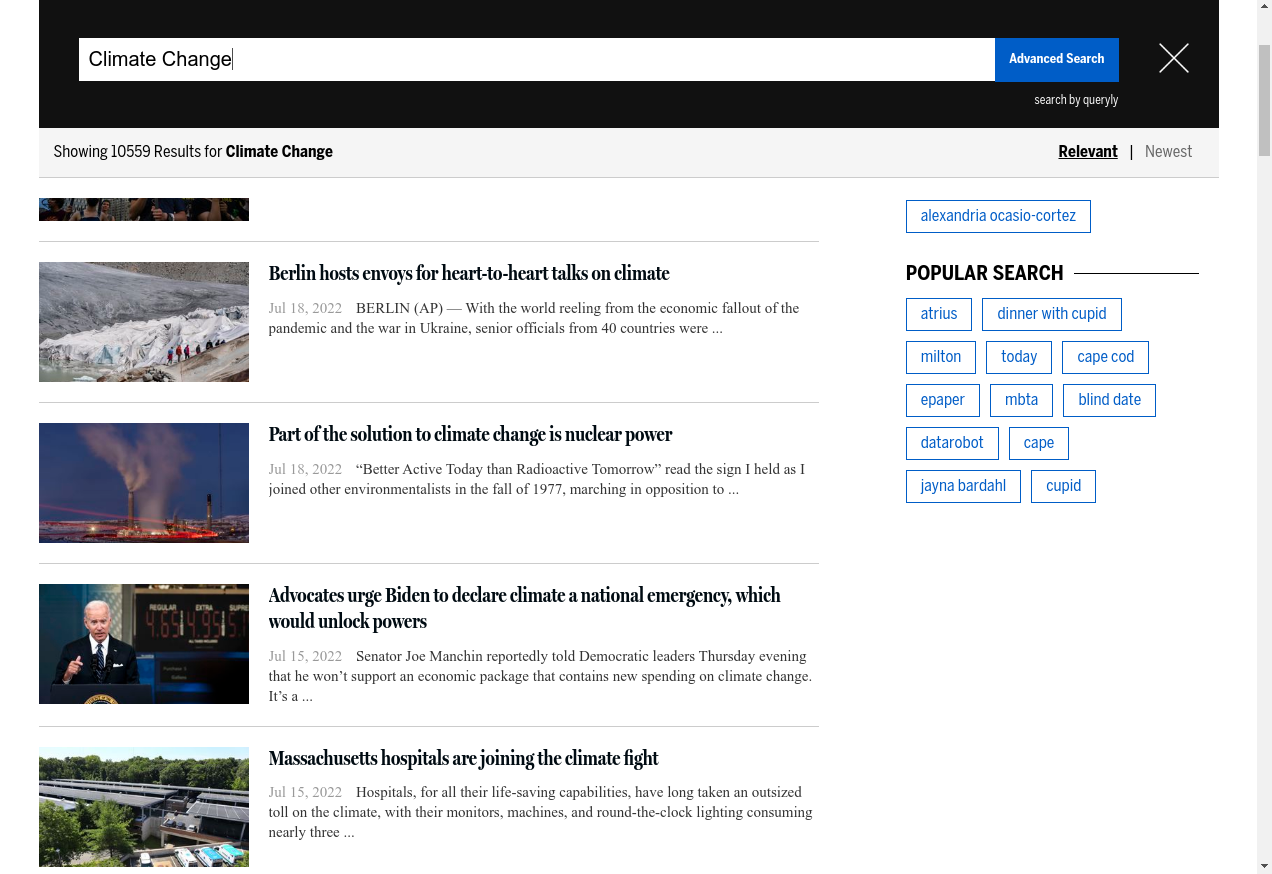 4. I fill "Search The Boston Globe": "Climate Change"