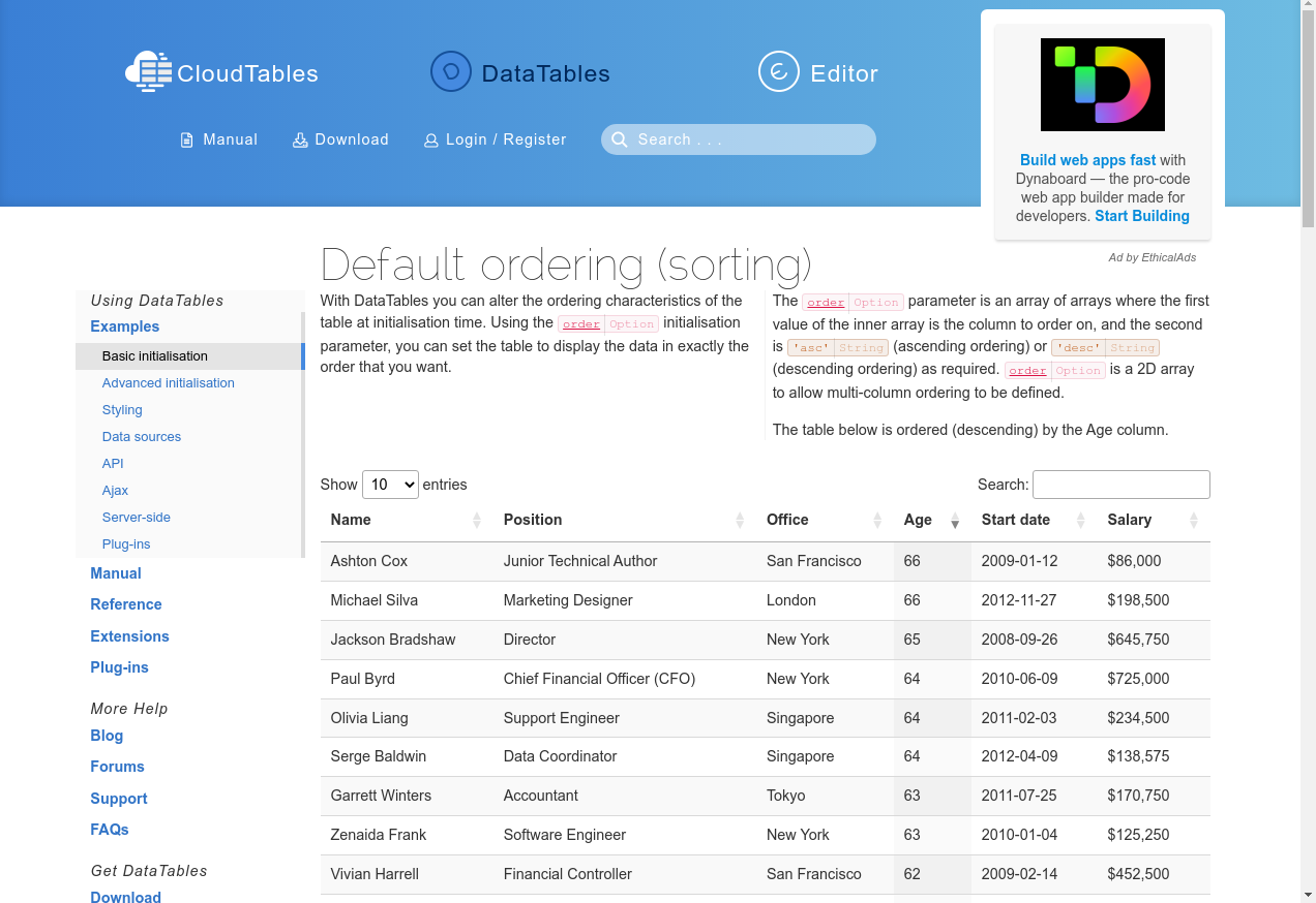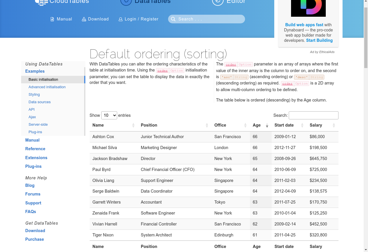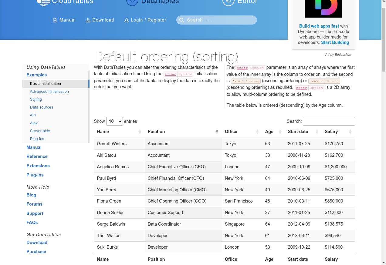 2. I go to "https://datatables.net/examples/basic_init/table_sorting.html"